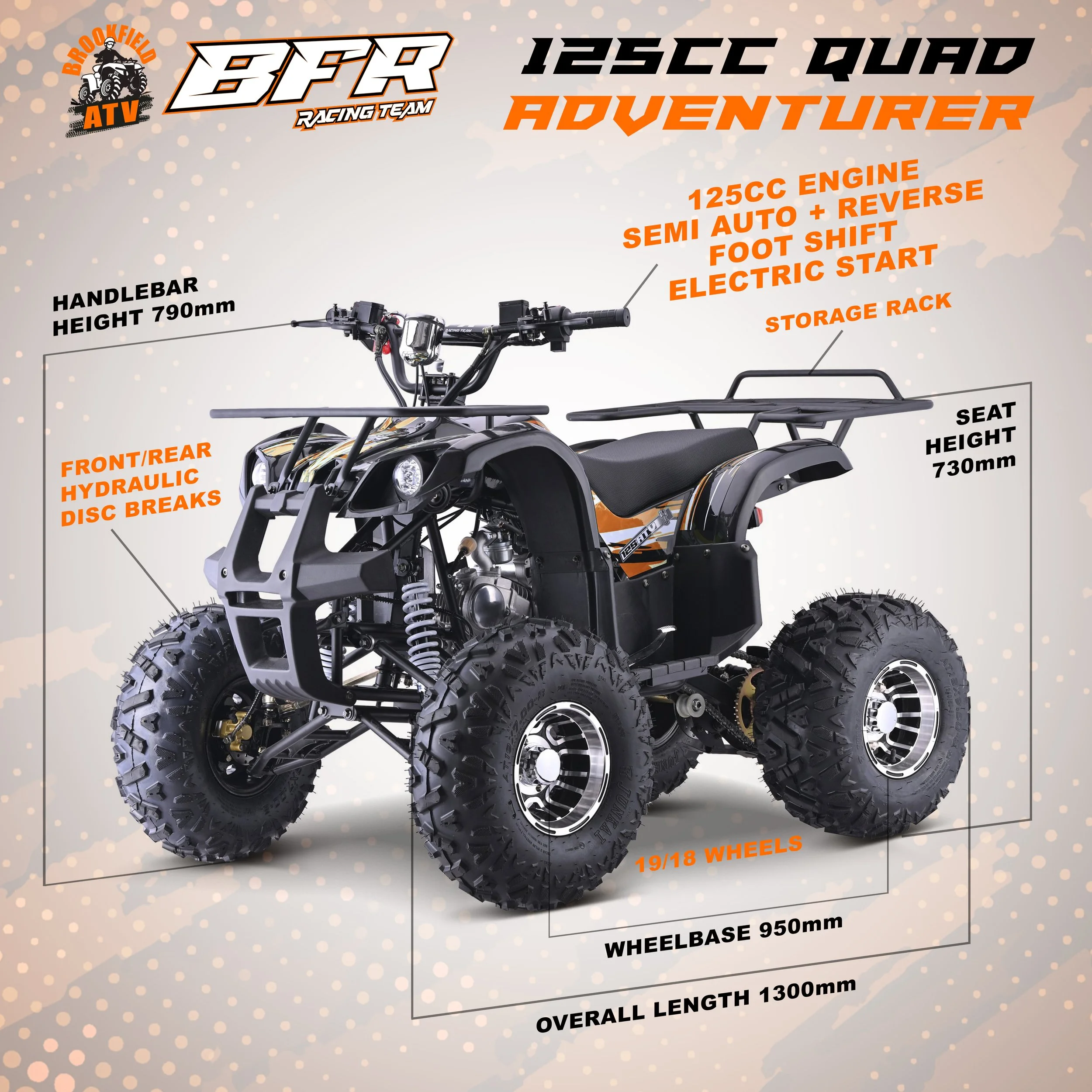 The NEW BFR Adventurer 125cc junior/adult quad bike is a Utility style ATV that boasts a huge range of great features. Including chain transmission with semi automatic gear change and reverse and hydraulic all terrain front and rear shock absorbers. With a top speed of 70km/h and additional features include speedometer with gear display, fitted front/rear utility rack and 8” alloy rims.