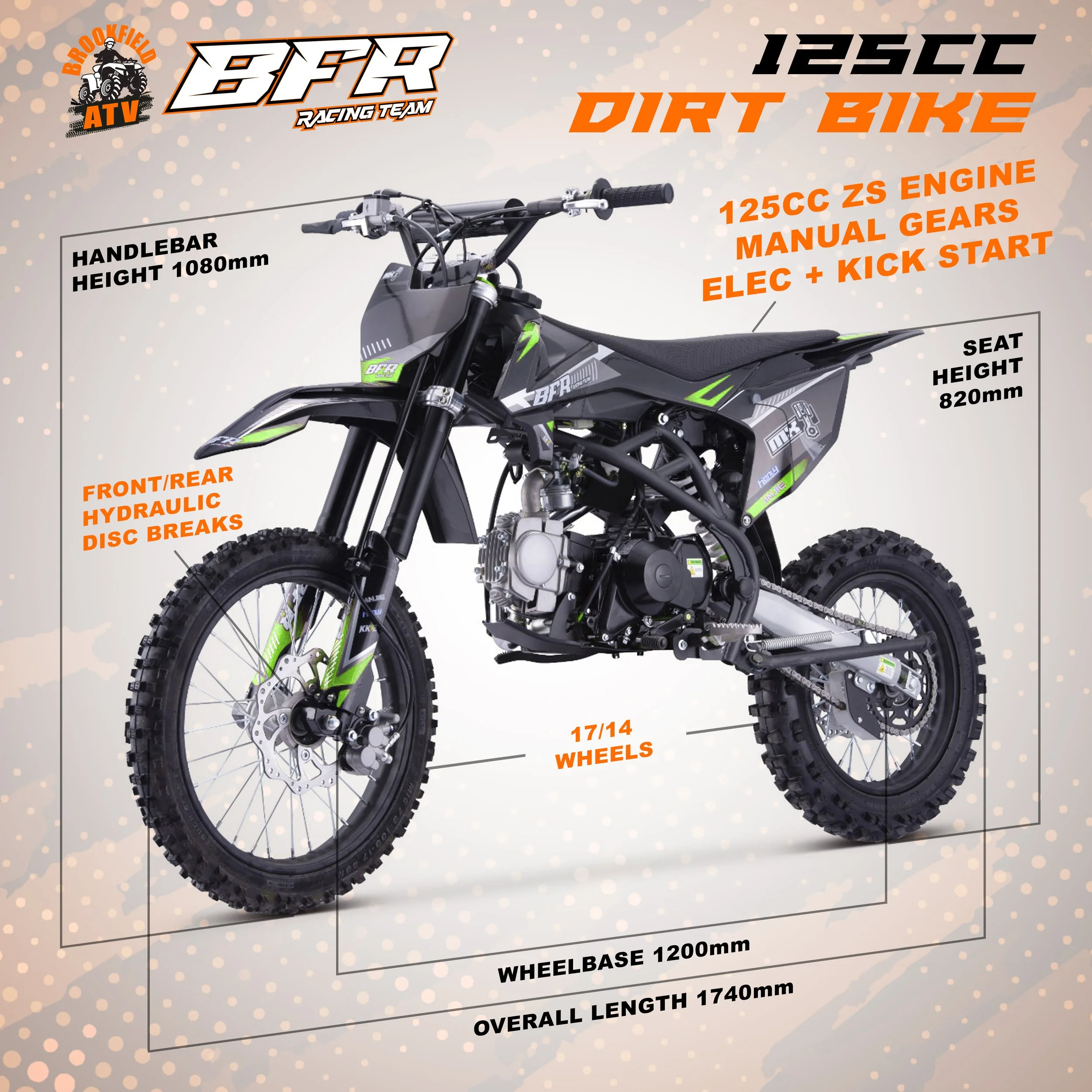 BFR racing team 125cc motocross style Dirt Bike is designed for off road use only with performance, reliability and endurance, as we worked directly with our manufacturers to build the perfect junior/adult size dirt bike. The manual engine is for more the advanced rider who's destined to beat the crowd and lead from the front! It packs a punch with the stronger triangle girders steel frame. Don't be confused by other pit bikes online, with this model sure to tackle any terrain. If you're wanting a fun, thrilling adrenaline packed off-road ride, this bike is for you! The BFR racing team 125cc 4-Stroke Dirt Bike The latest generation of ZS 125cc engines are faster, torquier, more reliable and even easier to set up and start than ever before. Kick-start improved carburettor and all of the standard safety features, support and reliability that BFR racing team Dirt bike provides.