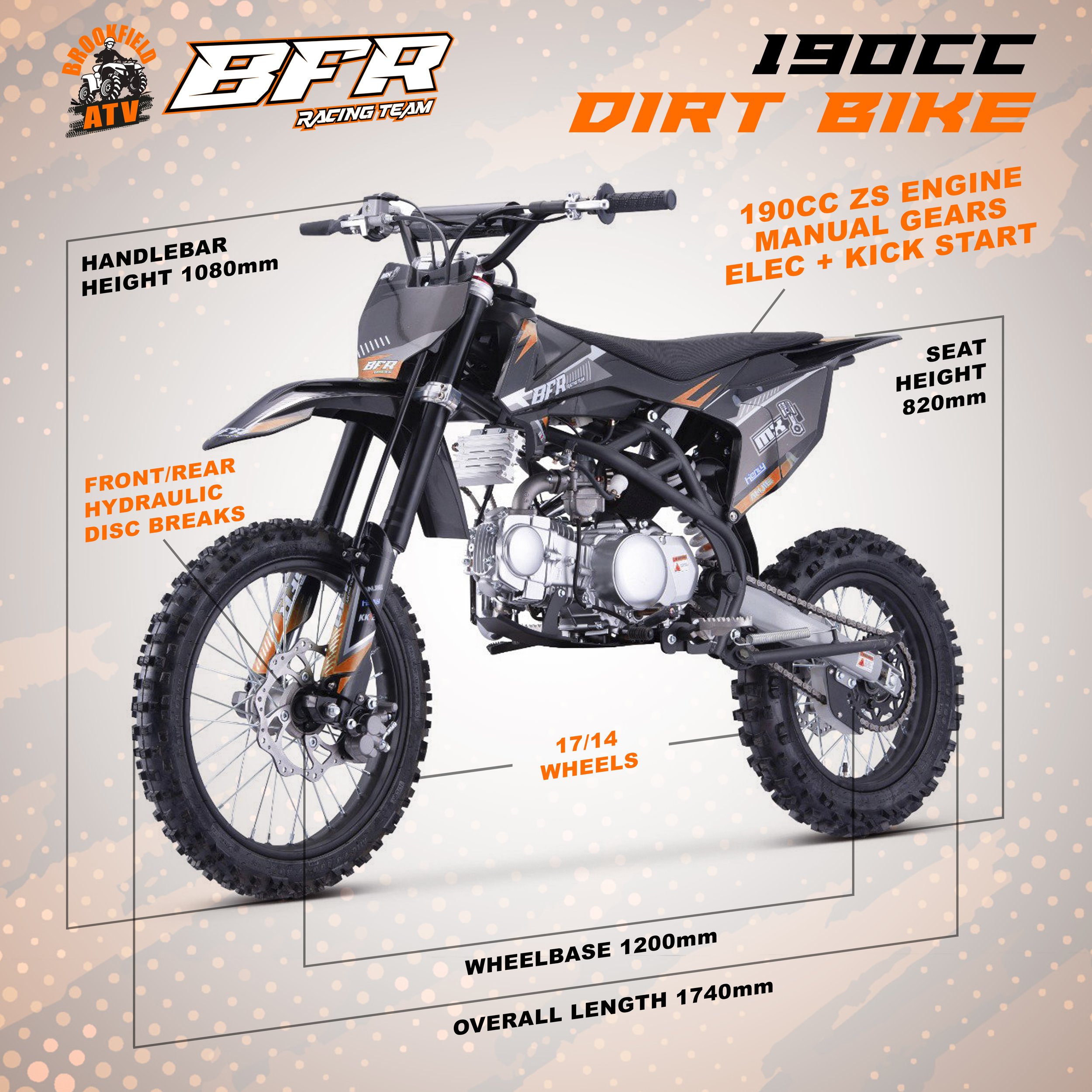 BFR racing team 190cc motocross style Dirt Bike is designed for off road use only with performance, reliability and endurance, as we worked directly with our manufacturers to build the perfect junior/adult size dirt bike. The manual engine is for more the advanced rider who's destined to beat the crowd and lead from the front! It packs a punch with the stronger design steel frame. Don't be confused by other pit bikes online, with this model sure to tackle any terrain. If you're wanting a fun, thrilling adrenaline packed off-road ride, this bike is for you! The BFR racing team 190cc 4-Stroke Dirt Bike The latest generation of ZS 190cc engines are faster, torquier, more reliable and even easier to set up and start than ever before. Kick-start improved carburettor and all of the standard safety features, support and reliability that BFR racing team Dirt bike provides.