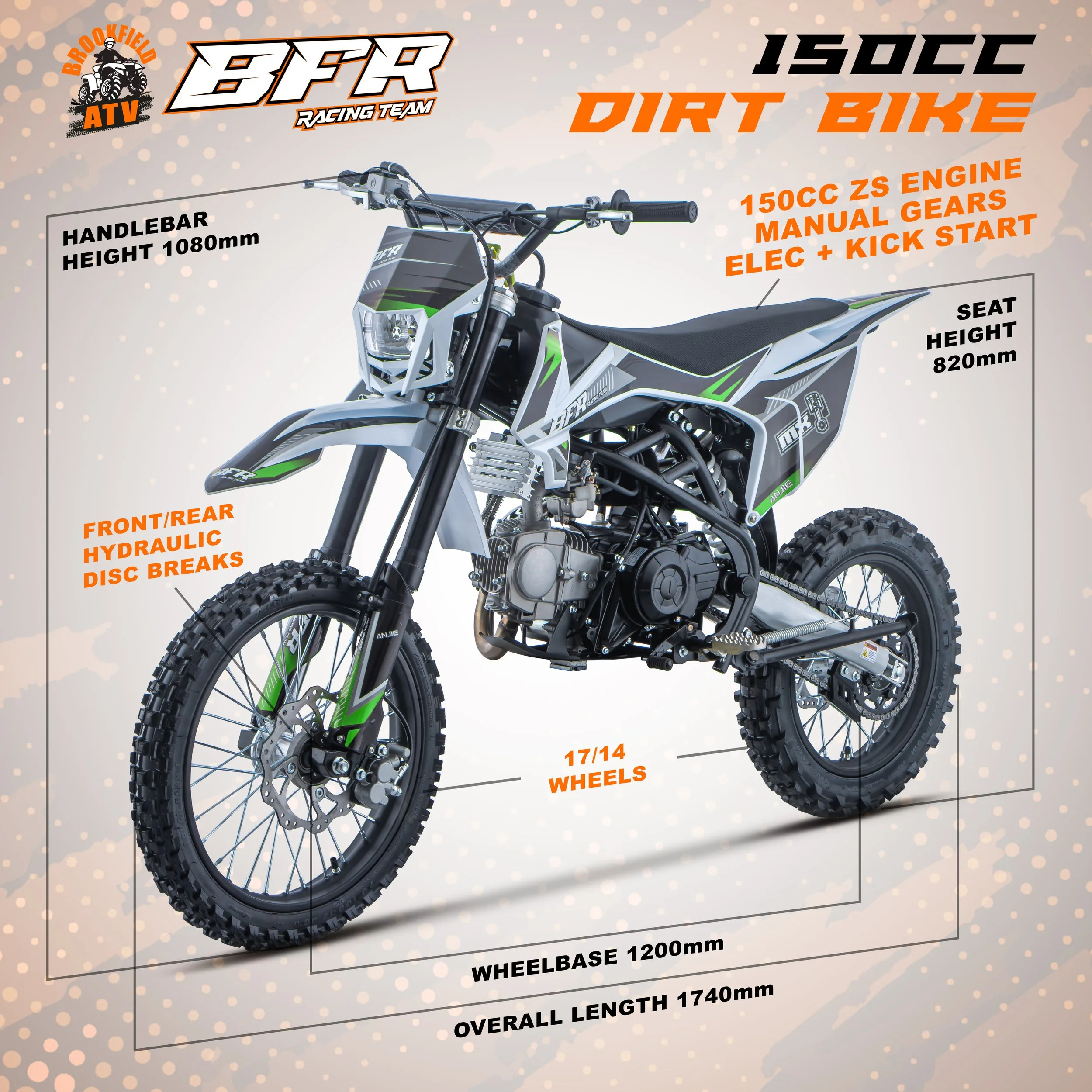 BFR racing team 150cc motocross style Dirt Bike is designed for off road use only with performance, reliability and endurance, as we worked directly with our manufacturers to build the perfect junior/adult size dirt bike. The manual engine is for more the advanced rider who's destined to beat the crowd and lead from the front! It packs a punch with the stronger design steel frame. Don't be confused by other pit bikes online, with this model sure to tackle any terrain. If you're wanting a fun, thrilling adrenaline packed off-road ride, this bike is for you! The BFR racing team 150cc 4-Stroke Dirt Bike The latest generation of ZS 150cc engines are faster, torquier, more reliable and even easier to set up and start than ever before. Kick-start improved carburettor and all of the standard safety features, support and reliability that BFR racing team Dirt bike provides.